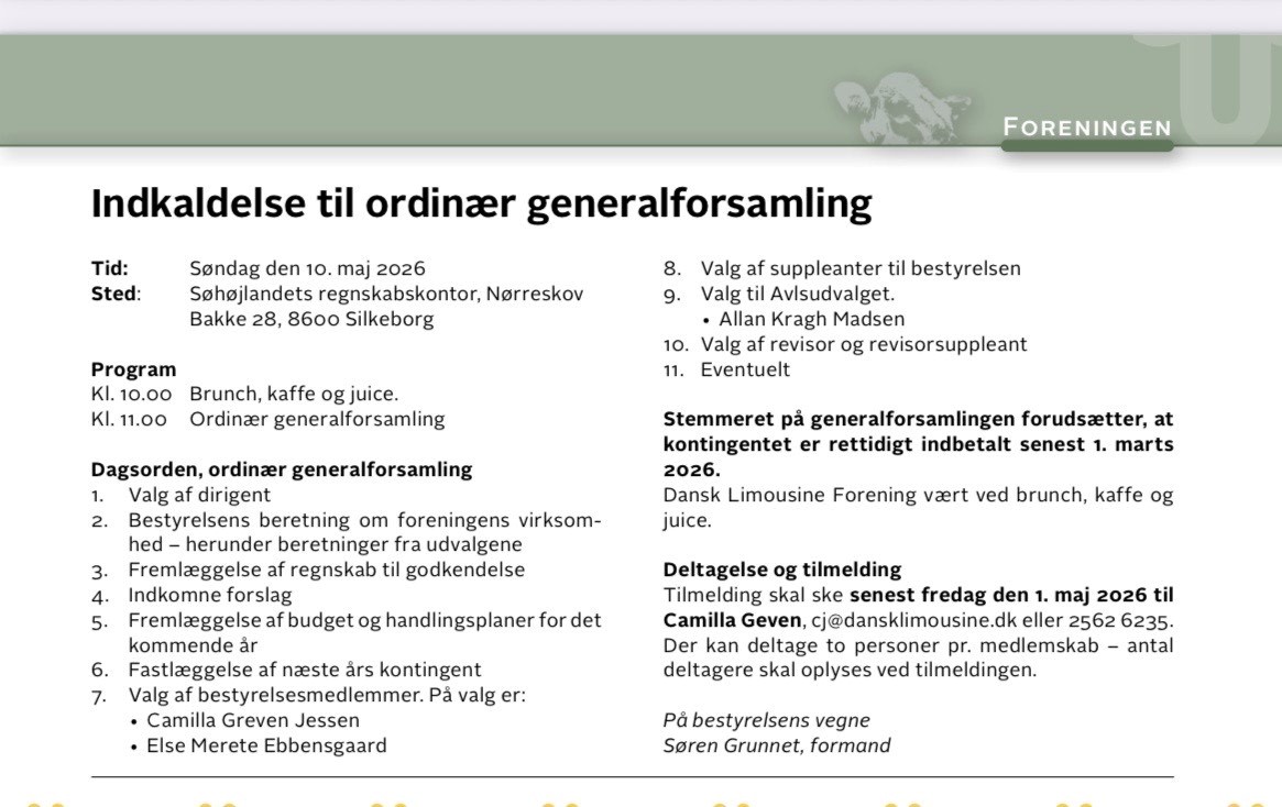 Tilmeld aktivitet Vis tilmeldinger (3) Generalforsamling i Dansk Limousine Forening 10. maj 2026 Kl. 10:00 Sidste tilmeldingsfrist: 01. maj 2026 Kl. 23:59